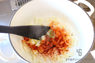 厚手の鍋にエキストラヴァージンオリーブオイルを入れて鍋を中火で温め、粗みじん切りにした玉ねぎと材料2を炒め始める。 -