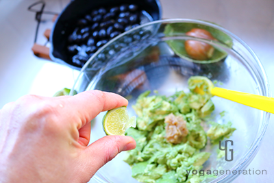 器に2のアボカド・ディップをよそって、1のパクチーと炒めた黒豆を添える。混ぜ合わせながら頂く。