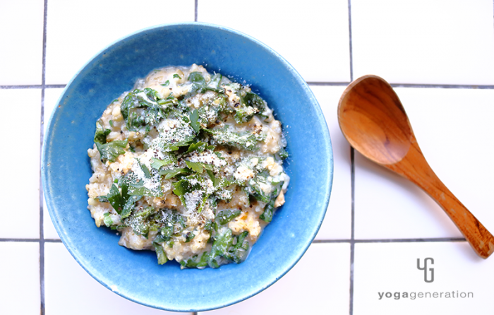 今回は牛乳の優しい味わいを生かした、どこかほっとするようなおじやです。仕上げに粉チーズとたっぷりの黒胡椒でアクセントを加えます。
