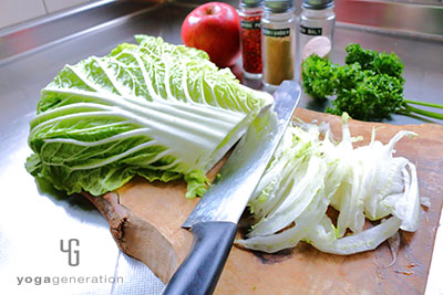 白菜、リンゴを千切りにする。パセリは粗めのみじん切りにする。 -