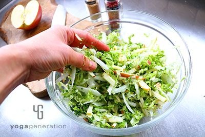- リンゴはよく洗い、皮付きのまま千切りにすると皮の赤い色が残って美しい。