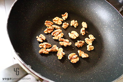 クルミはフライパンで低温で熱しながら乾煎り、もしくはトースターでこんがりするまで加熱したら、冷ましておく。 -