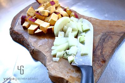 サツマイモは皮付きのままよく洗い、玉ねぎは皮をむいて洗う。それぞれ1〜2cmの角切りにする。 -