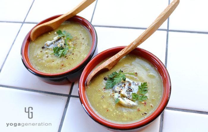 スープの温かさで徐々に溶けていくブルーチーズの味わいが、サツマイモの甘さとぴったりです!サツマイモの優しい黄色に合わせて、器も黄色に。ホーローの懐かしい雰囲気が可愛らしいですね。