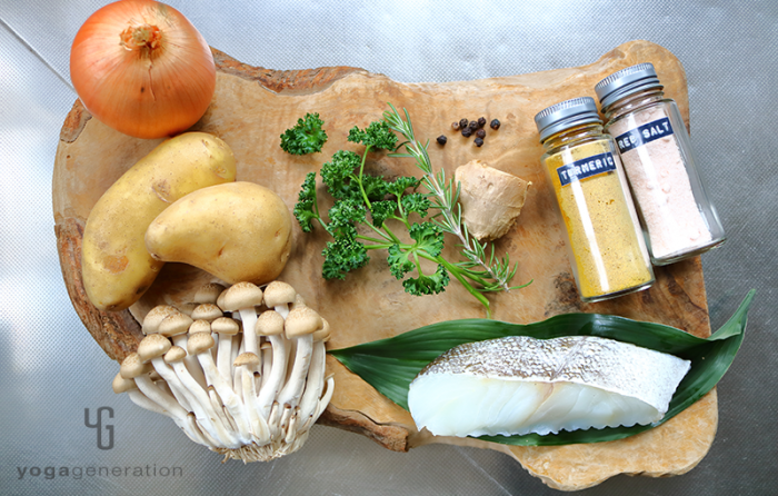 タラは一口大に切り、軽く塩を振っておく。シメジは石づきをとってほぐす。玉ねぎは粗いみじん切り、ジャガイモは皮をむき1〜2cmの角切り、ショウガはみじん切りにする。 -
