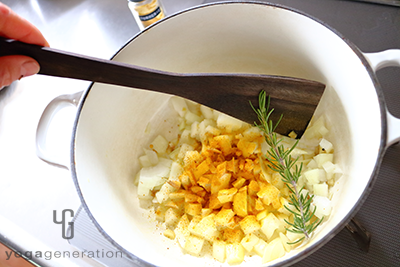 厚手の鍋にエキストラヴァージンオリーブオイルを回し入れ、弱めの中火にする。ショウガ、玉ねぎ、ローズマリー、ターメリックを加えてじっくり炒める。 -