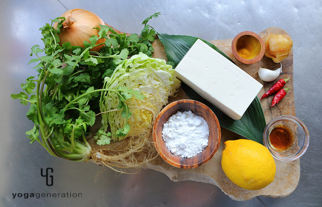 キャベツはざく切りにする。玉ネギとショウガとニンニクは粗みじん切りにする。パクチーは葉の部分はざく切りに、茎と根(付いていれば)はみじん切りにして別にしておく。 -