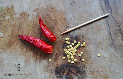 赤唐辛子の種を爪楊枝などで取り除く(激辛が好きな方は取り除かなくてもOK)。 -