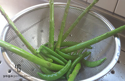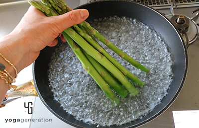 - アスパラガスの長さのフライパンがない場合は、4〜5cmほどの長さにカットして茹でる。その場合も、先に根元を、次に穂先の方を加える。
