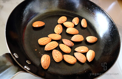 アーモンドをフライパンに入れて弱火で熱する。ぷっくり膨らんでシワが伸びてきたらすぐに器に取り出し、冷ましておく。 -