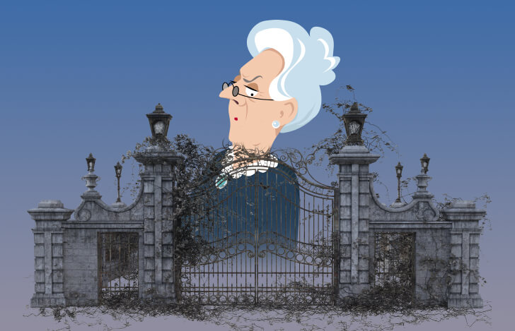 れんが造りの大きな城がまえの建築で、高い鉄柵に囲まれており、同じような背の高い鉄の門がついています。その門が閉ざして錠がおりると、ジェーンは「とじこめられた囚人のような気がする…」と物語の冒頭に書いています。
