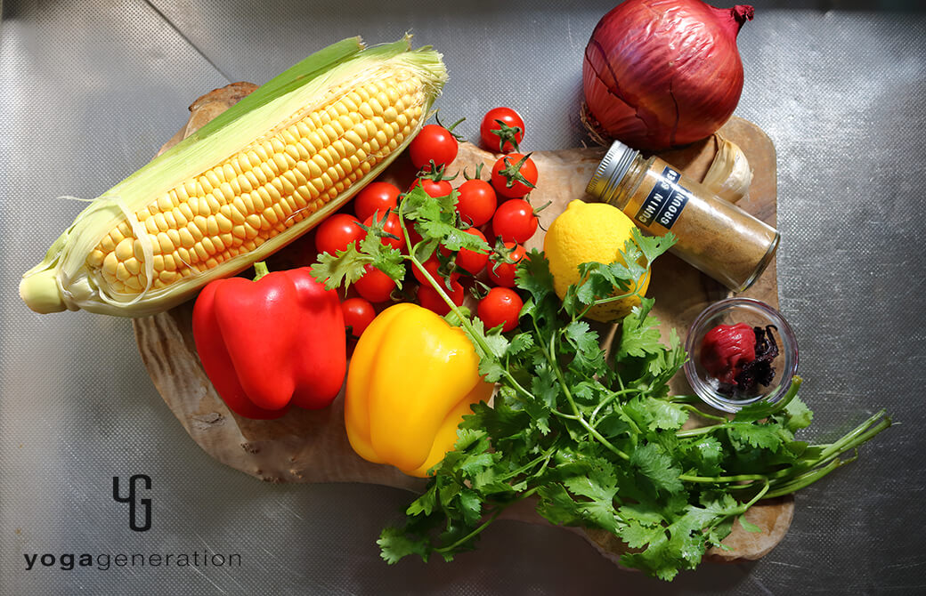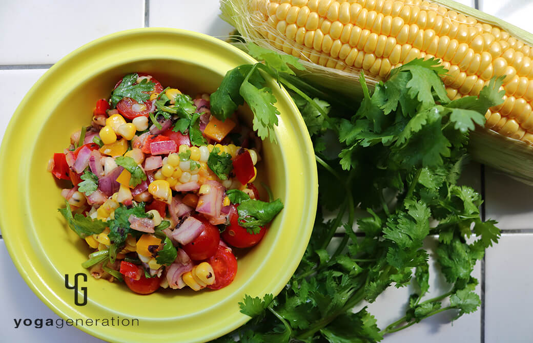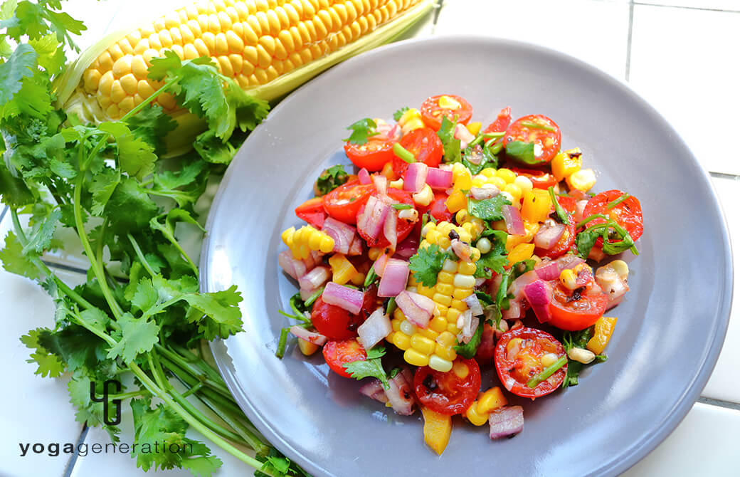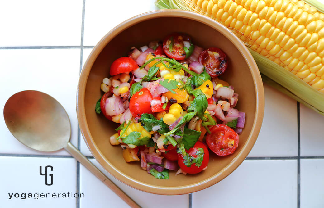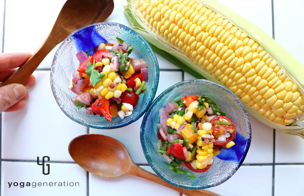 今月のピックアップ食材は真っ赤なトマトと鮮やかな黄色のトウモロコシ。そして今回ご紹介のレシピは、スプーンでザクザク食べたいサラダです。赤と黄色のパプリカに緑のパクチー、紫のタマネギを加えて、さらに色合いと食感に楽しさをプラス!