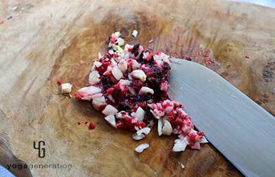 ニンニクを包丁の背で潰してから粗いみじん切りにする。梅干しの種を取り、シソの葉とともにニンニクと刻み合わせる -