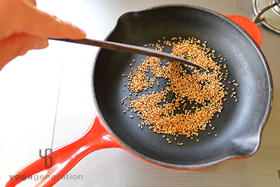 フライパンを中火で熱し、金ゴマを炒る。香ばしい香りがしてきたら火からおろして冷ましておく。 -