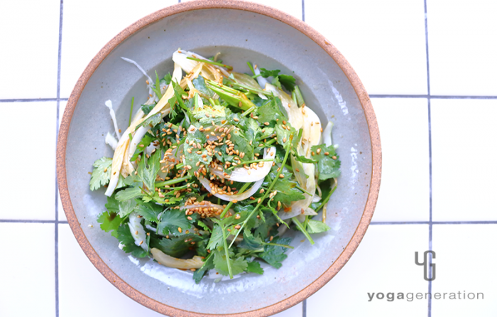 今回は、同じく香りが特徴的でゆるベジには欠かせないパクチーを合わせて、ゴマが香ばしいサラダをご紹介です!金ゴマをたっぷり加えるのが美味しさのポイントです♪