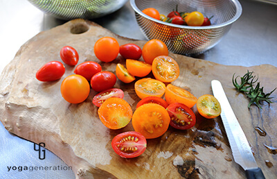 トマトをカットする。縦にカットしたり、横にカットしたり、はたまたカットせずに、丸いままだったり。バリエーションを持たせるとそれぞれの食感の違いを楽しめます。ニンニクは半量は荒いみじん切りに、残りは皮付きのままとっておく。 -
