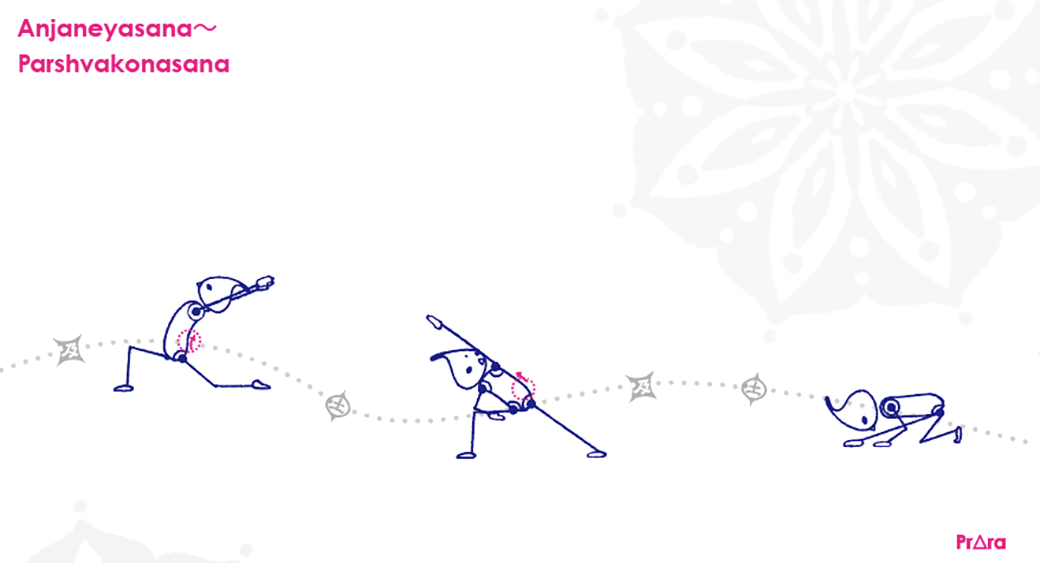 例えば、アンジャネーヤアサナからパールシュバコナーサナの流れを見てみましょう。