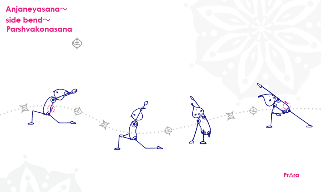 では、パールシュバコナーサナの前にアンジャネーヤアサナの側屈バリエーションをさらに足してみると…