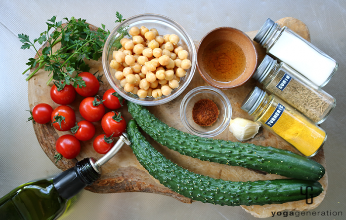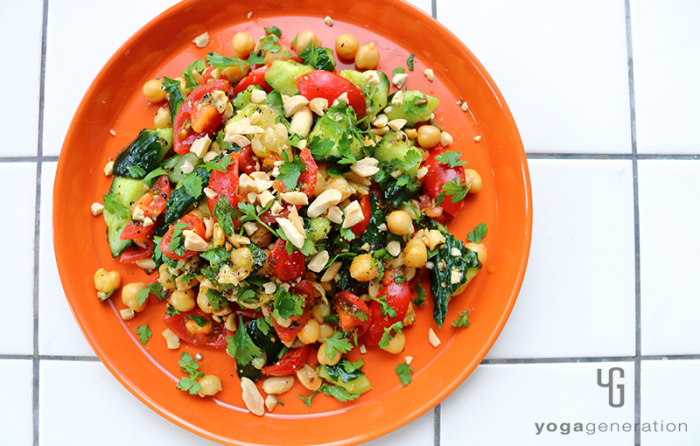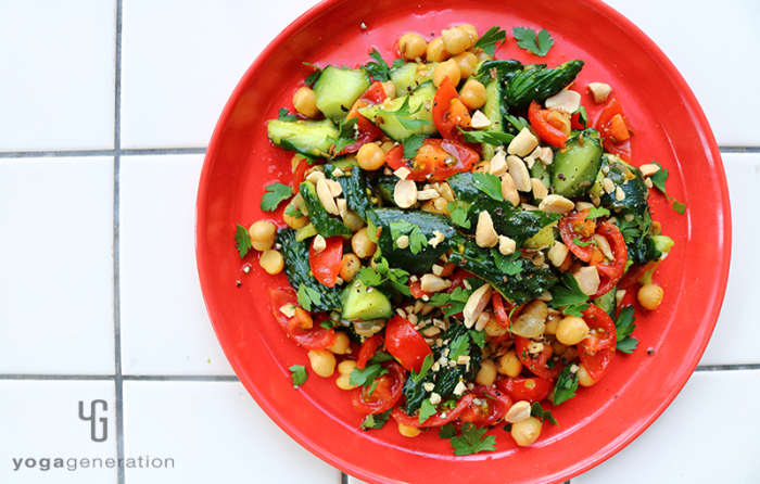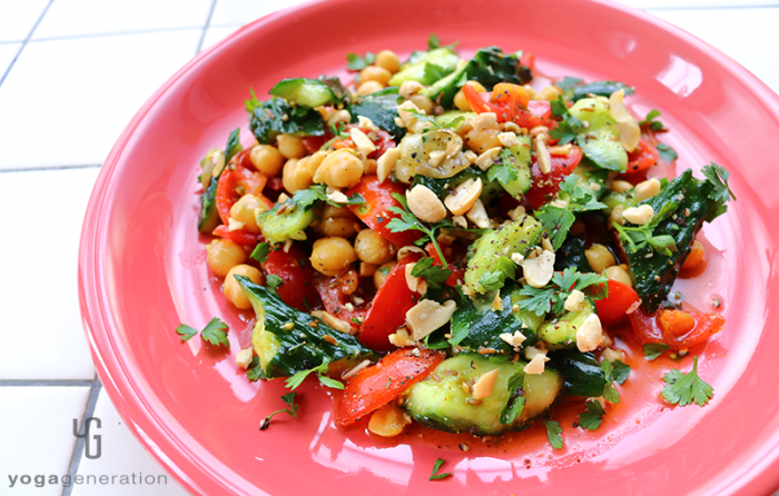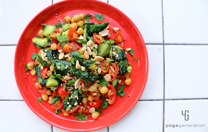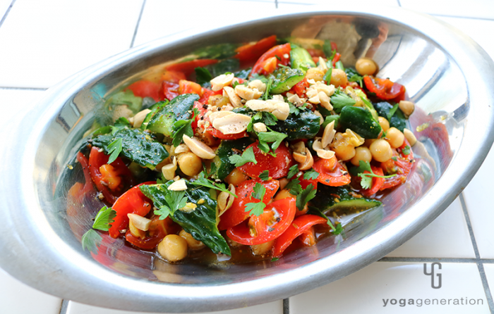 キュウリのシャキシャキ感とポリポリ感、ヒヨコ豆のホクホクにピーナッツのカリカリ。トマトの甘さと酸味も加わって口の中から鼻腔に抜ける香りが、なんともいえずアジアを旅している気分♪