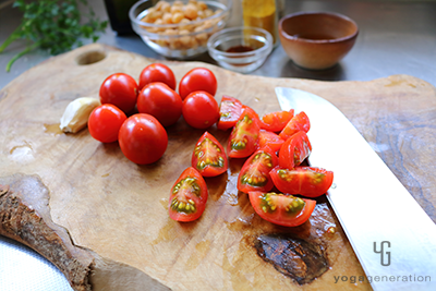 トマトは輪切りするように上下に二等分した後に、それを半分に切る。 -