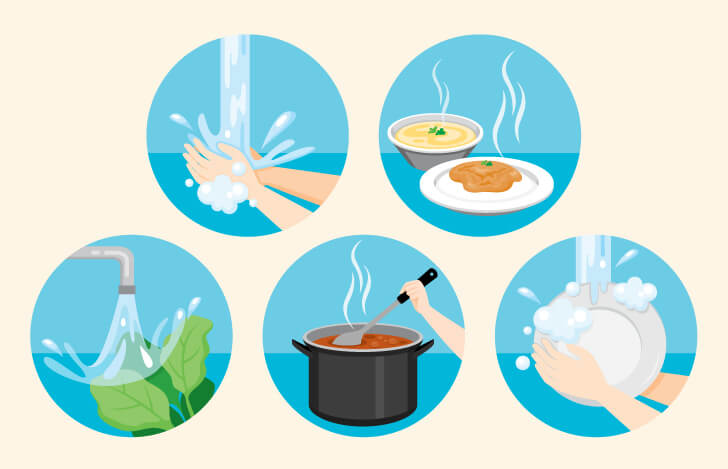 肉や魚、卵などを使った後の調理器具は、洗剤でよく洗ってから、熱湯をかけて殺菌しましょう。台所用殺菌剤の使用も効果的です。