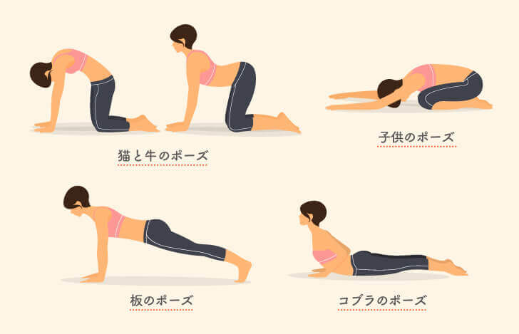 PMSの改善には、呼吸法、瞑想・リラックス、および、猫と牛のポーズ、子供のポーズ、板のポーズ、コブラのポーズがおすすめです。