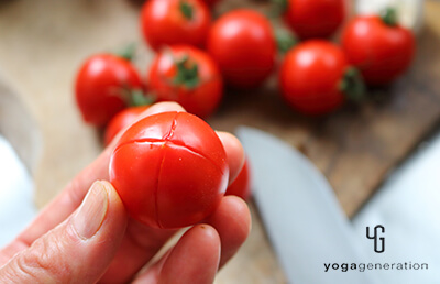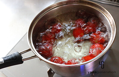 鍋に水を入れて沸騰させる。その間にトマトはヘタを取り、皮の部分に十文字に切り込みを入れる。 -