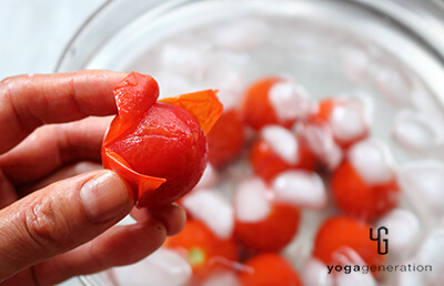 湯が沸騰したら、氷水を用意する。沸騰した湯にトマトを加えてさらに加熱する。トマトの皮の端がめくれてきたらすぐに取り出し、用意した氷水に浸ける。 -