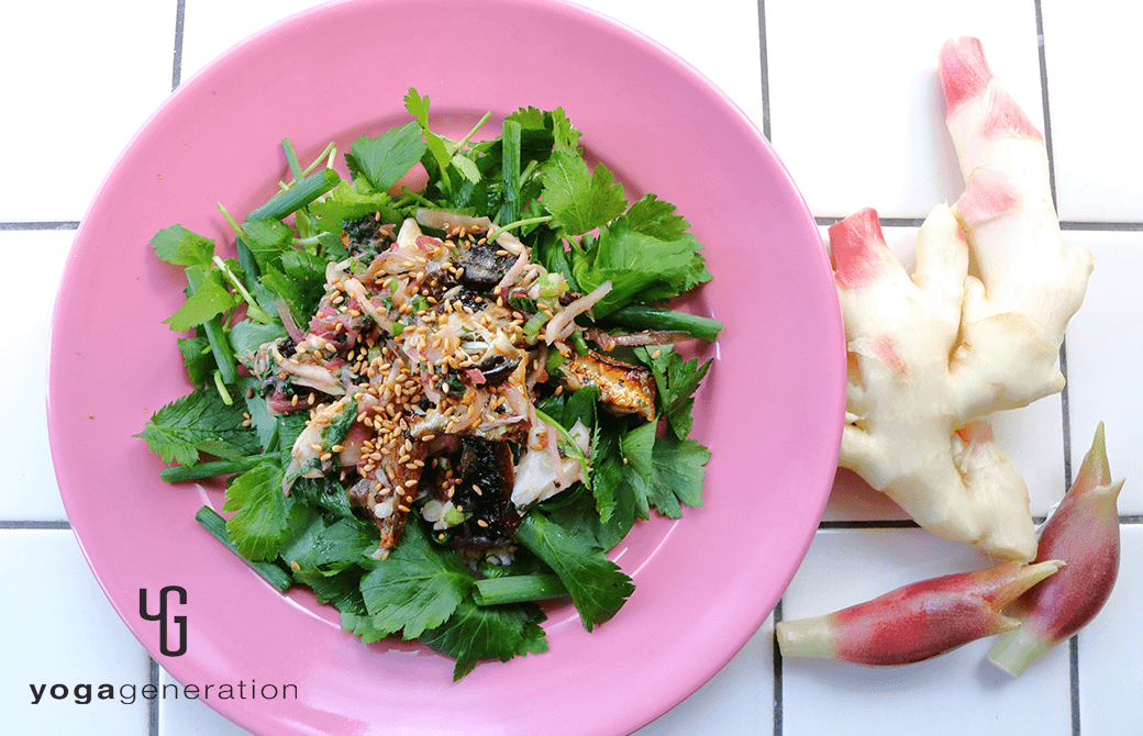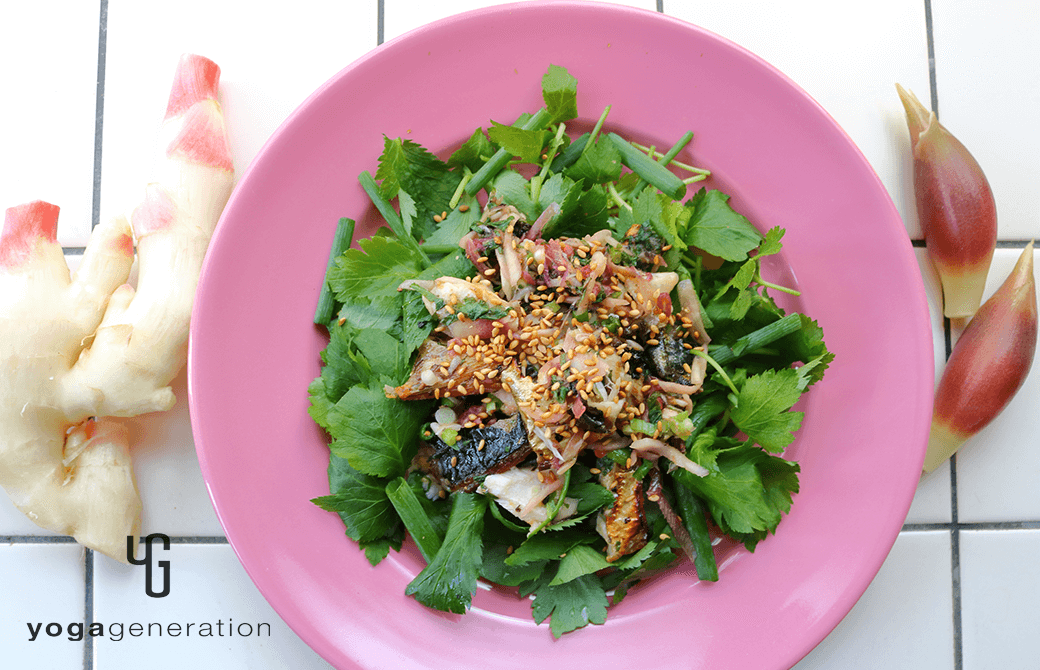 今回はショウガの爽やかな辛さと塩サバのコク、梅の酸味のハーモニーを楽しむサラダです。様々な香味野菜の香りと食感が、さらにサラダに『美味しさ』の層を重ねてくれます!