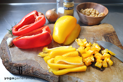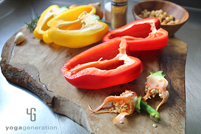 今回はパプリカを使います。カラフルな色合いはもちろん、赤パプリカには脂肪燃焼効果があると言われているカプサイシンが豊富、黄パプリカはビタミンCに加え、肌の老化防止に力を貸すと期待されているルテインも豊富です。