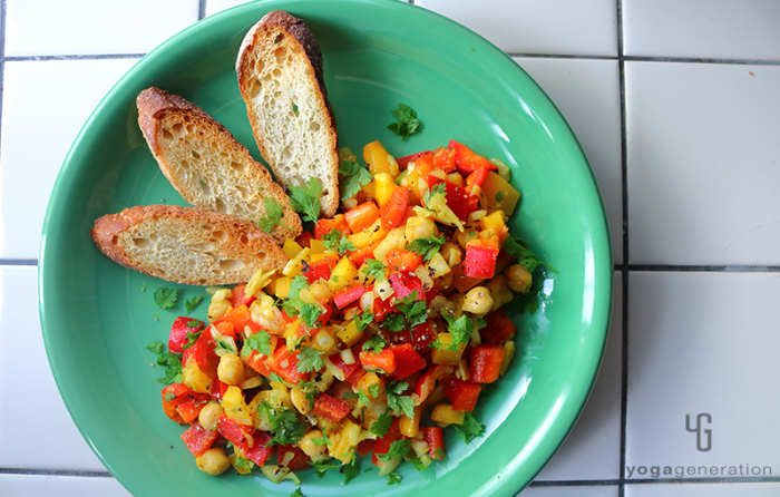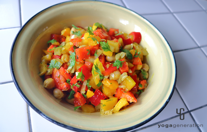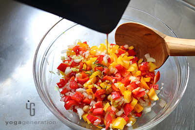 パプリカは約1cm角の角切り、タマネギは粗みじん切りにする。ニンニクはすりおろすしてボウルへ入れ、ヒヨコ豆の水煮も加えて軽く塩を振り、ざっくりと混ぜ合わせる。 -