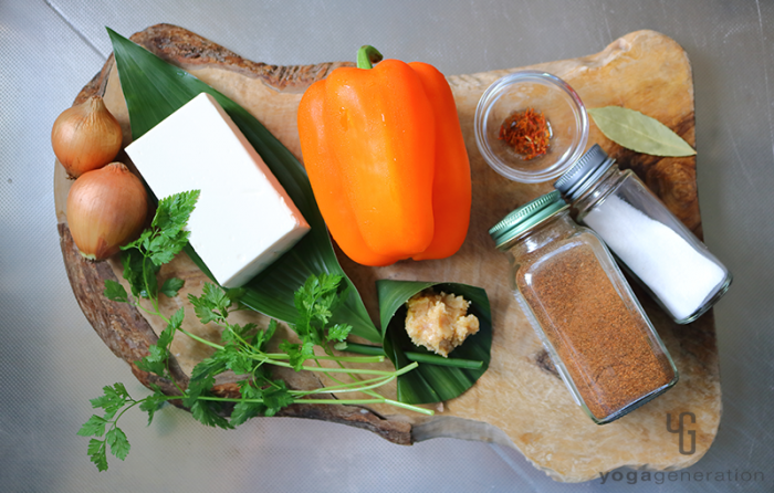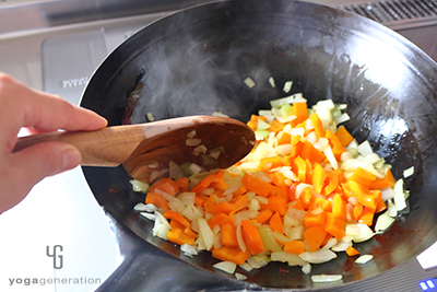 オレンジパプリカとタマネギを1cm角切りにする。フライパンにエキストラヴァージンオリーブオイルを加えて熱し、切ったパプリカとタマネギ、塩、チリパウダーとサフランを加えて弱火で丁寧に炒める。 -