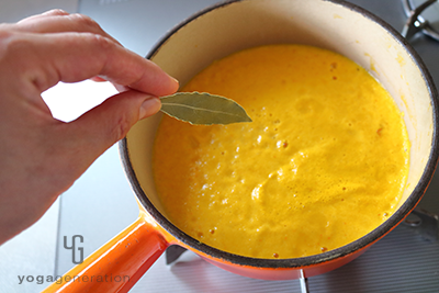 1と少なめの水(分量外)を加えてミキサーでなめらかに攪拌し、鍋に移す。ローリエを加えて弱火で火を通す。 -