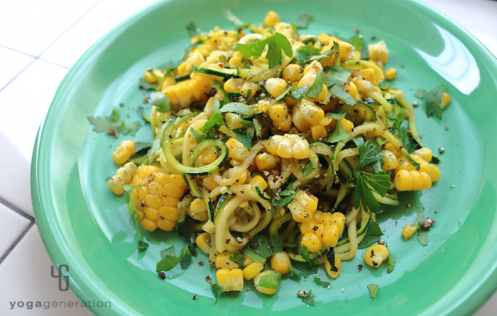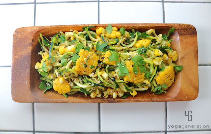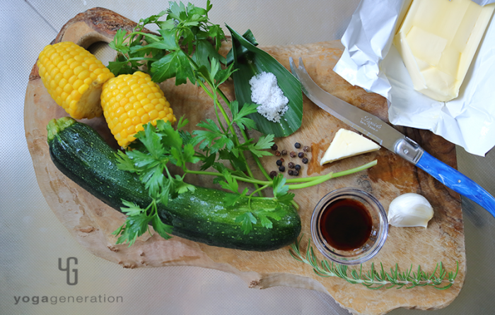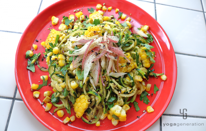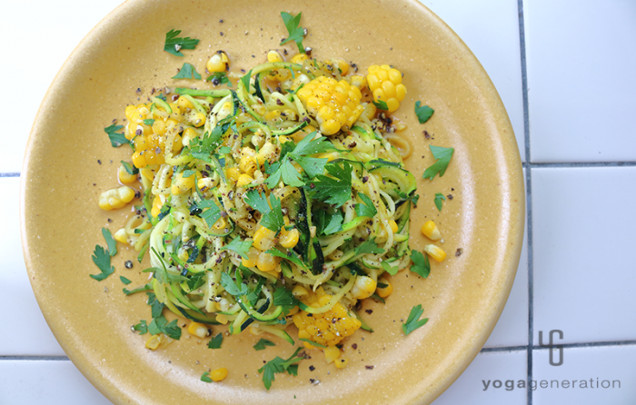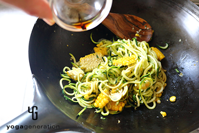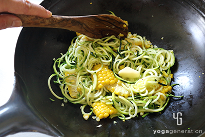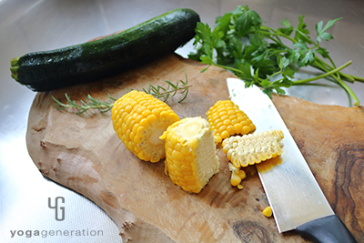 ズッキーニを麺状にカットする。茹でたトウモロコシは軸から切り離す。ニンニクはみじん切りにする。 -