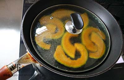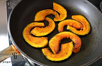 フライパンにオリーブオイルを入れ強火で温め、カボチャが重ならないようにフライパンに並べて両面をこんがり焼き付ける。 -