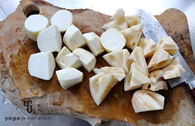 レンコンは皮付きのまま、サトイモは皮をむいて大きめの一口大にカットする。