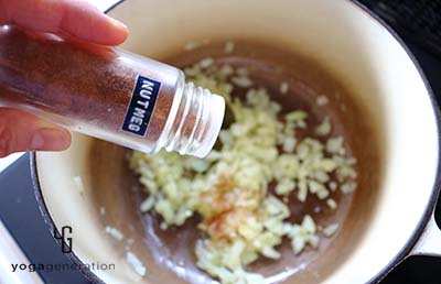 鍋にEVオリーブオイルと潰した1のニンニクとタマネギを入れ、軽く塩を振り中弱火で炒める。 -