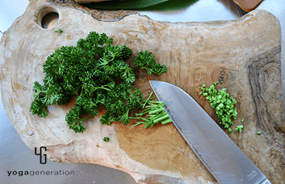 パセリの葉の部分は手でもぎり取る。茎の部分はみじん切りにする。 -