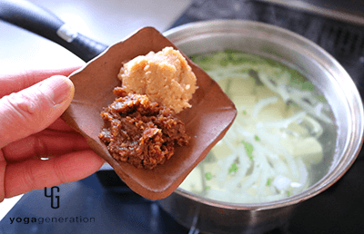 タマネギに火が通って半透明になったら、火を止め味噌を加えて好みの塩加減に調える。出来れば二種類の味噌を加える方が味わいに深みが加わります。 -