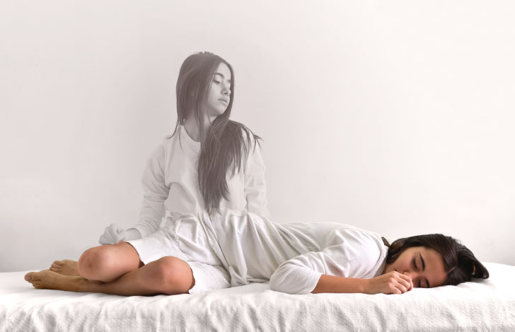 時には、部屋全体を観察しながら、その部屋の中で横たわる身体を客観視します。それはまさに魂が身体から抜けた幽体離脱の状態です。