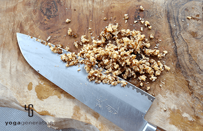 干し椎茸とニンニクはできる限り細かく刻む。パクチーは小口切りにする。 -