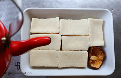 平らな皿に高野豆腐と干し椎茸を並べて、彼らがひたひたになるくらいのお湯(分量外)を回し掛け、しばらく置いておく。 -
