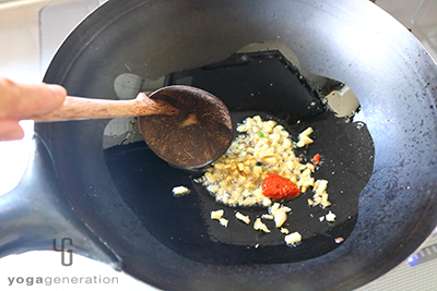 鍋に胡麻油を入れて弱火で熱し、豆板醤、ショウガを加えて炒める。香りが立ってきたら干しシイタケと高野豆腐を加えて中火にし、2〜3分炒める。 -