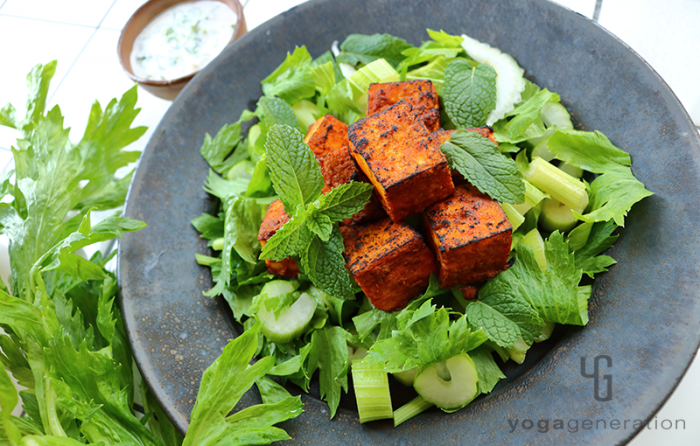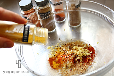 厚揚げを焼いている間にヨーグルト・ソースを作る。フレッシュ・ハーブはみじん切りにし、材料の全てを混ぜ合わせておく。