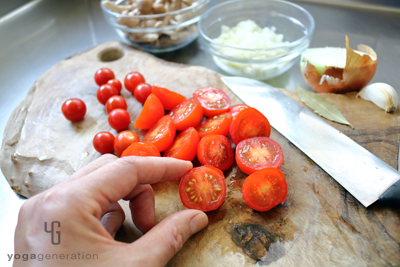 トマトはヘタとお尻(上下)を分けるように半分に切る。シメジは石づきを切り離してほぐし、玉ネギ・ニンニクは粗いみじん切りにする。 -