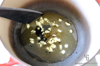 厚手の鍋にオリーブオイルを注ぎ、ニンニクを加える。ごく弱火で火を入れ、ニンニクの香りをたたせる。 -