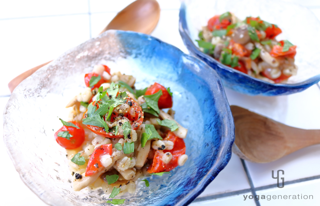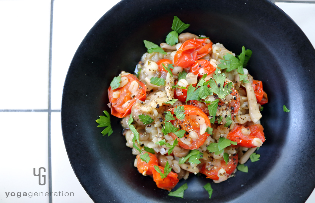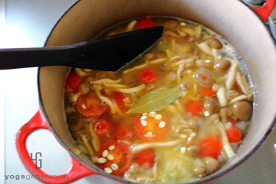 玉ネギが透明になったらトマトとシメジを加えてざっくり油をなじませたら、☆を加え、素材たちがかぶるくらいの水(分量外)を加えて弱火にし、押し麦に火が通す。途中、水分が足りなくなったら様子をみて加える。 -