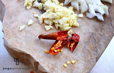 唐辛子を、手でちぎるように割る。唐辛子はタネに辛味があるので、辛いのが苦手な方はタネを取り除くと良い。 -