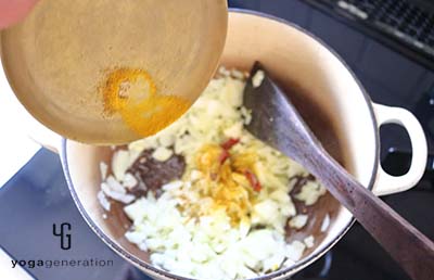 タマネギに火が通ったらターメリックとクミンパウダーを加えて、さらに炒め合わせる。スパイスを投入する際は、スパイスが入った器からそのまま振り入れるのではなく、別皿に取り分けてから加える。 -