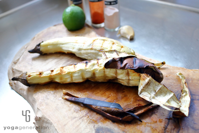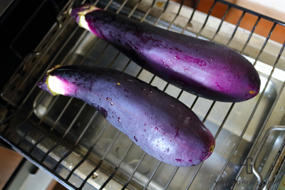 ナスはヘタ周りに一周切り込みを入れてガクの部分を切り離し、皮部分に縦に浅く切り込みを入れる(5〜6本)。グリルもしくはオーブンで皮に焦げ目がつくまで焼く(20分くらい)。 -